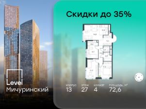 В жилом квартале, расположенном на границе с природным заказником "Долина реки Очаковки", продаётся 4-комнатная квартира площадью 72.60 кв.м без отделки. Квартира расположена на 27 этаже 31-этажного корпуса 13 в жилом комплексе бизнес-класса Level Мичуринский (компания Level Group/Левел групп).