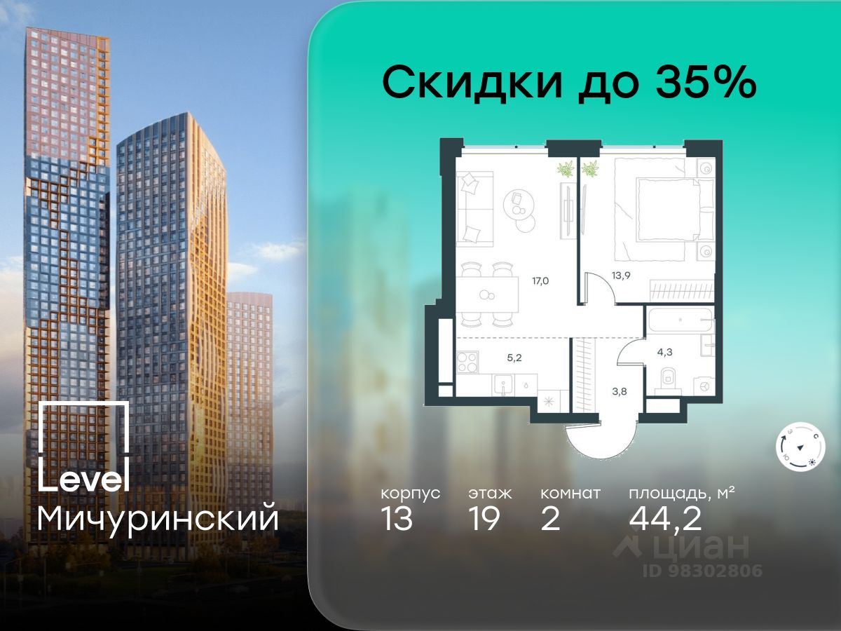 В жилом квартале, расположенном на границе с природным заказником "Долина реки Очаковки", продаётся 2-комнатная квартира площадью 44.20 кв.м без отделки. Квартира расположена на 19 этаже 31-этажного корпуса 13 в жилом комплексе бизнес-класса Level Мичуринский (компания Level Group/Левел групп).