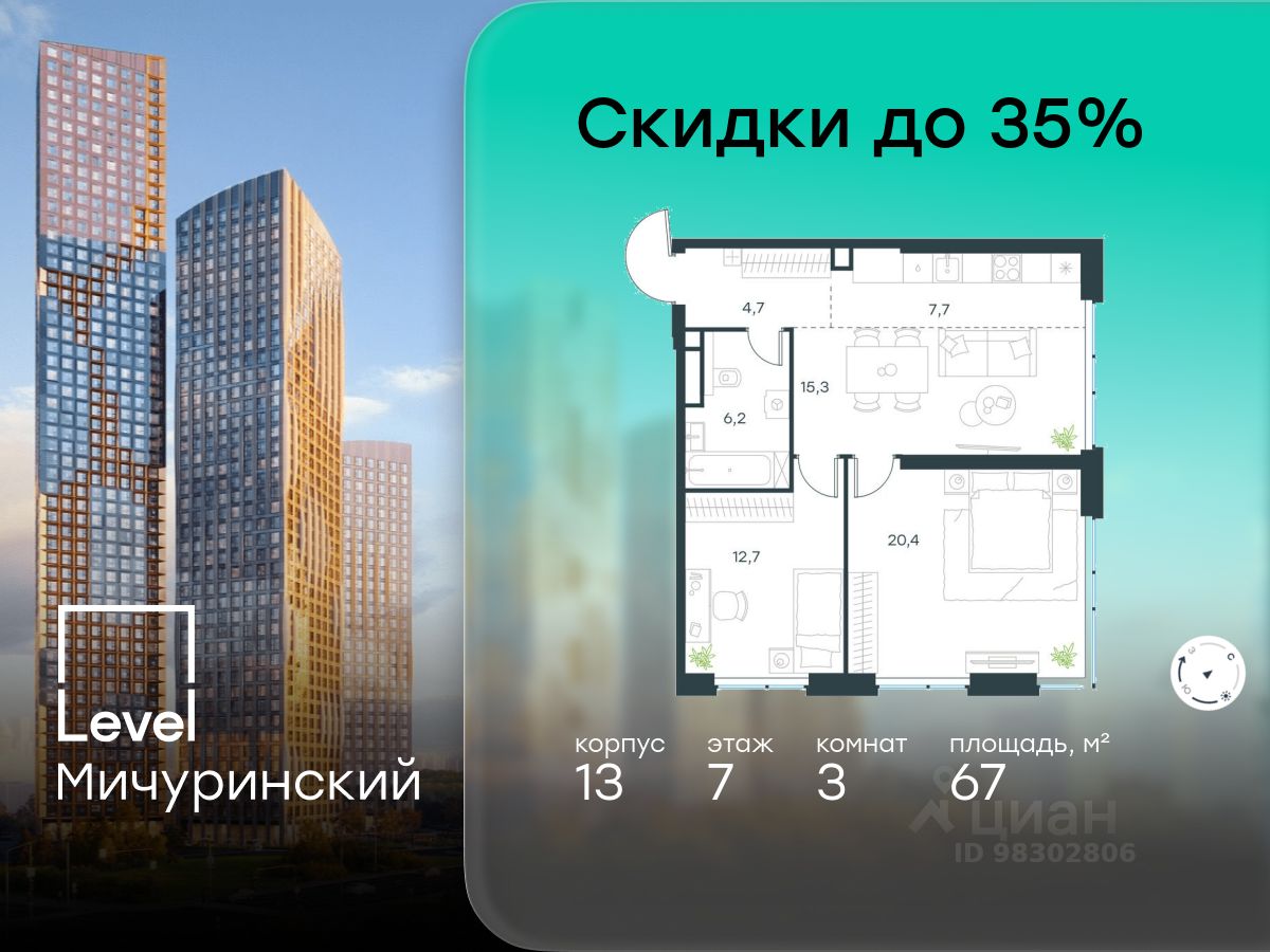В жилом квартале, расположенном на границе с природным заказником "Долина реки Очаковки", продаётся 3-комнатная квартира площадью 67.00 кв.м без отделки. Квартира расположена на 7 этаже 31-этажного корпуса 13 в жилом комплексе бизнес-класса Level Мичуринский (компания Level Group/Левел групп).
