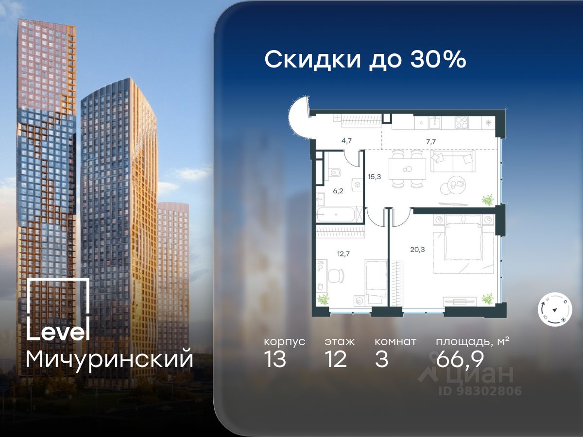 В жилом квартале, расположенном на границе с природным заказником "Долина реки Очаковки", продаётся 3-комнатная квартира площадью 66.90 кв.м без отделки. Квартира расположена на 12 этаже 31-этажного корпуса 13 в жилом комплексе бизнес-класса Level Мичуринский (компания Level Group/Левел групп).