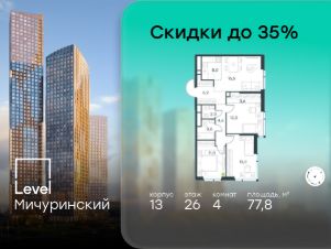 В жилом квартале, расположенном на границе с природным заказником "Долина реки Очаковки", продаётся 4-комнатная квартира площадью 77.80 кв.м без отделки. Квартира расположена на 26 этаже 31-этажного корпуса 13 в жилом комплексе бизнес-класса Level Мичуринский (компания Level Group/Левел групп).