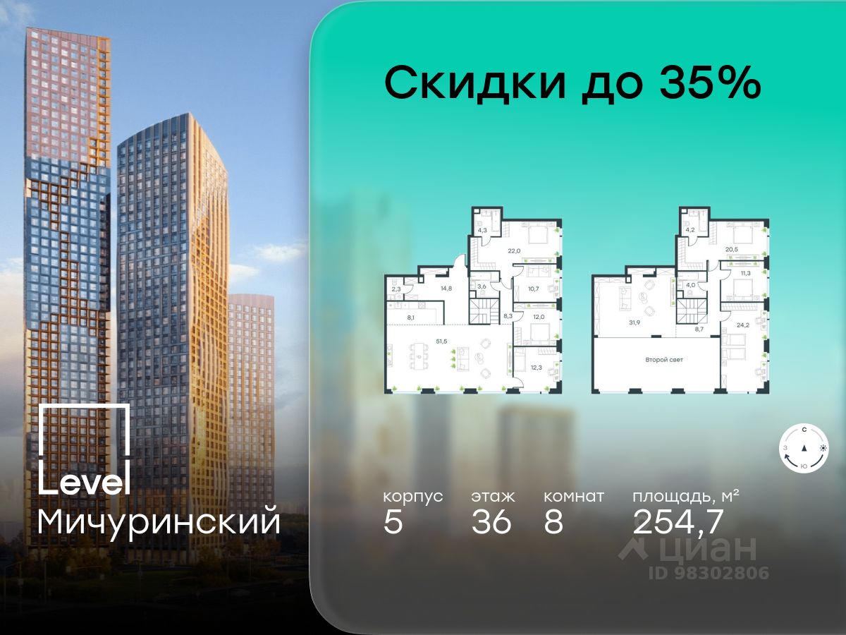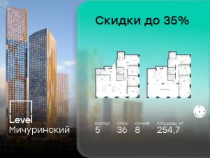 В жилом квартале, расположенном на границе с природным заказником "Долина реки Очаковки", продаётся многокомнатная квартира площадью 254.70 кв.м без отделки. Квартира расположена на 36 этаже 37-этажного корпуса 5 в жилом комплексе бизнес-класса Level Мичуринский (компания Level Group/Левел групп).