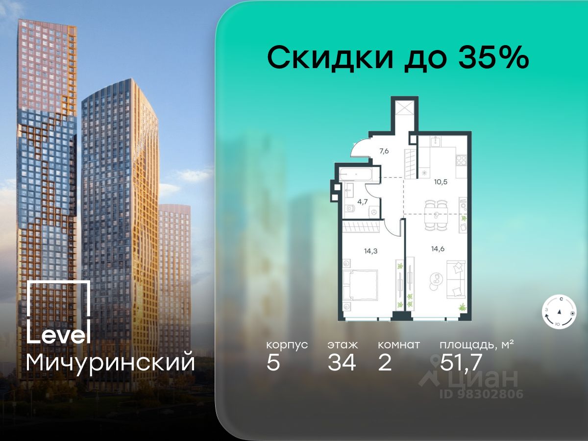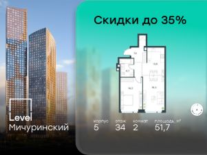 В жилом квартале, расположенном на границе с природным заказником "Долина реки Очаковки", продаётся 2-комнатная квартира площадью 51.70 кв.м с отделкой white box. Квартира расположена на 34 этаже 37-этажного корпуса 5 в жилом комплексе бизнес-класса Level Мичуринский (компания Level Group/Левел групп).