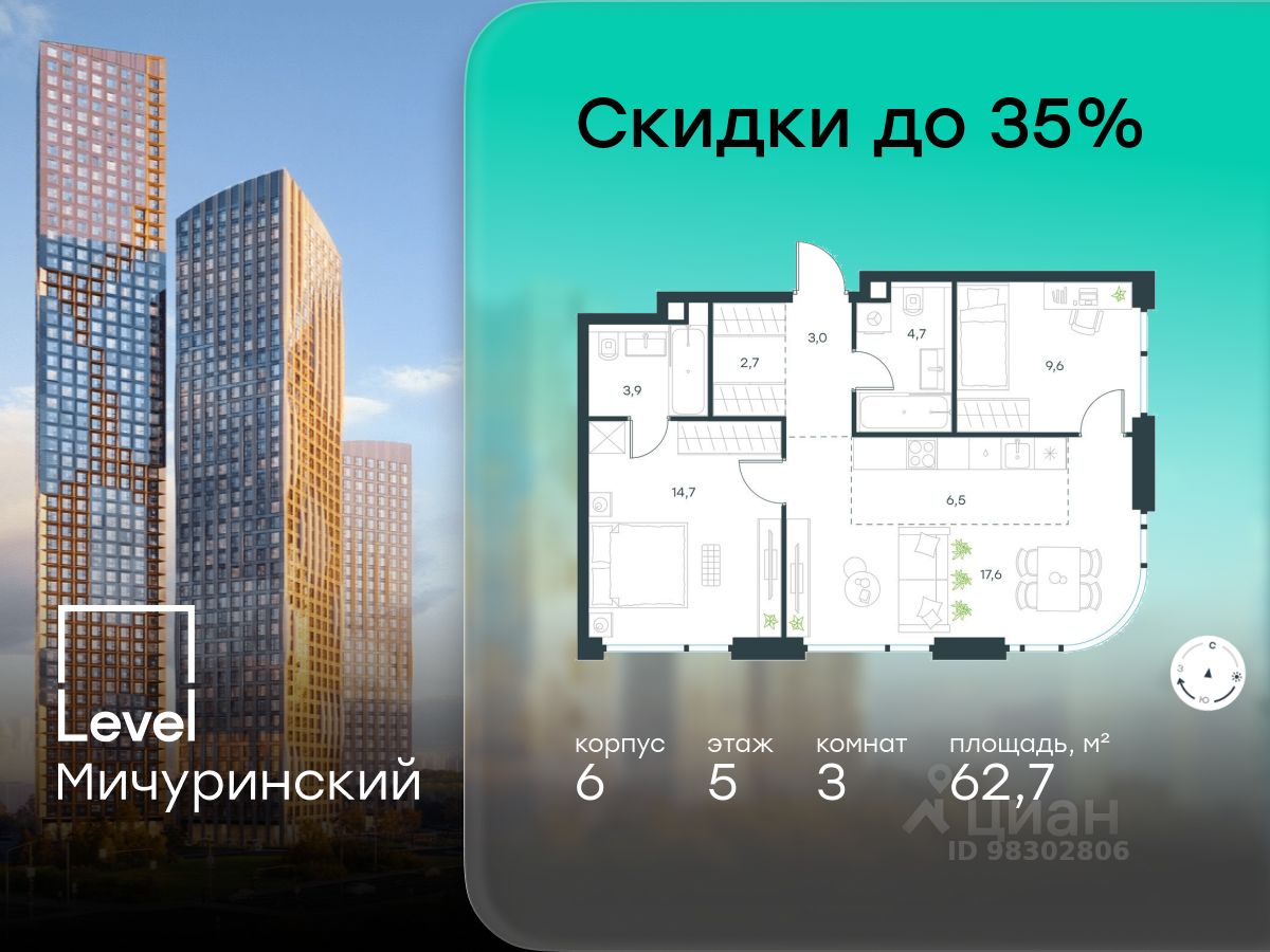 Цена указана с учётом скидки при 100%-й оплате, несубсидированной ипотеке, рассрочке (кроме программы "Рассрочка 0%"). В жилом квартале, расположенном на границе с природным заказником "Долина реки Очаковки", продаётся 3-комнатная квартира площадью 62.70 кв.м без отделки. Квартира расположена на 5 этаже 20-этажного корпуса 6 в жилом комплексе бизнес-класса Level Мичуринский (компания Level Group/Левел групп). Отличная транспортная доступность - 10 мин. пешком до станции метро "Мичуринский проспект" - 15 мин. пешком до станции метро "Аминьевская" - 7 мин. на авто до МКАД - 10 мин. на авто до ТТК - 15 мин. на авто до Москва-Сити Продуманный архитектурный проект - Выразительная архитектура от известных бюро: корпуса 1-6 - СПИЧ, корпуса 7-13 - Borisov Architects; - Из окон открываются живописные виды на парки, Москва-Сити и МГУ; - Высокие потолки до 6,35 м; - Стильные лобби с окнами в пол и высокими потолками до 4,7 м; - С каждого этажа дома на лифте можно спуститься в подземный отапливаемый паркинг. Расположение Level Мичуринский строится в одном из самых зеленых районов Москвы - Очаково-Матвеевское. Этот уголок столицы идеален для поддержания здорового образа жизни. В шаговой доступности от проекта находятся заказник "Долина реки Очаковки" - 1 мин. пешком и Очаковский парк - 7 мин. пешком. На велосипеде можно добраться до таких парков, как "Событие", парк Олимпийской деревни, парк 50-летия Октября и парк Школьников. В 15-минутной доступности на авто расположено более 30 детских садов (из них 14 в пешей доступности), 32 школы (из них 13 в пешей доступности) и 14 вузов. В ближайшем окружении работает более 25 медицинских учреждений, 11 спортивных клубов и 22 продуктовых супермаркета. Внутренняя инфраструктура На территории жилого комплекса строится три детских сада и школа. На первых этажах домов откроется супермаркет, фитнес-центр, ресторан, кафе и другие сервисы. Подземные этажи займут паркинги: трехуровневые в этапах 1 и 2, одноуровневый в этапах 3 и 4. Преимущества проекта - 4,5 га благоустроенной территории с видовым мостом, уличным кинотеатром, зонами для тихого отдыха, работы, воркаута, площадки для петанка, футбола, настольного тенниса и пляжного волейбола; - Дизайнерские лобби с панорамным видом на двор, мойками для лап животных и комфортными зонами ожидания. - Безопасность жителей: круглосуточное видеонаблюдение всех зон общего пользования (лобби, лифты, паркинги, детские площадки), система контроля доступа, управление видеодомофоном через мобильное приложение, единый ключ доступа на территорию жилого комплекса. - Технологии и комфорт: высокоскоростной Wi-Fi в лобби и на придомовой территории, автоматическая система контроля и учета ресурсов, абонентская связь с консьержем, распознавание номеров автомобилей при въезде/выезде в/из паркинга.