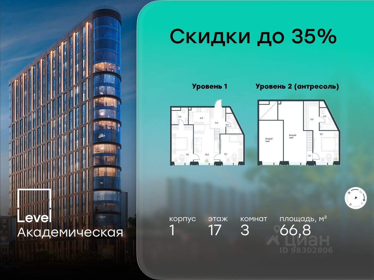 В Академическом районе продаётся 3-комнатная квартира площадью 66.80 кв.м без отделки. Квартира расположена на 17-м этаже 19-этажного жилого комплекса бизнес-класса Level Академическая (компания Level Group). В данной квартире вы можете оборудовать второй этаж (антресоль). Устройство антресольного этажа выполняется собственником самостоятельно как перепланировка квартиры. Нормативная площадь антресоли - не более 40% от площади квартиры.