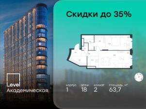 В Академическом районе продаётся 2-комнатная квартира площадью 63.70 кв.м без отделки. Квартира расположена на 18-м этаже 19-этажного жилого комплекса бизнес-класса Level Академическая (компания Level Group).