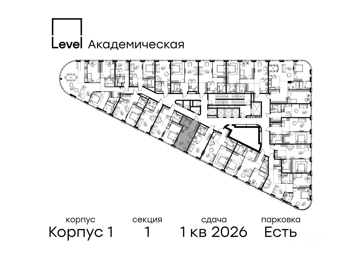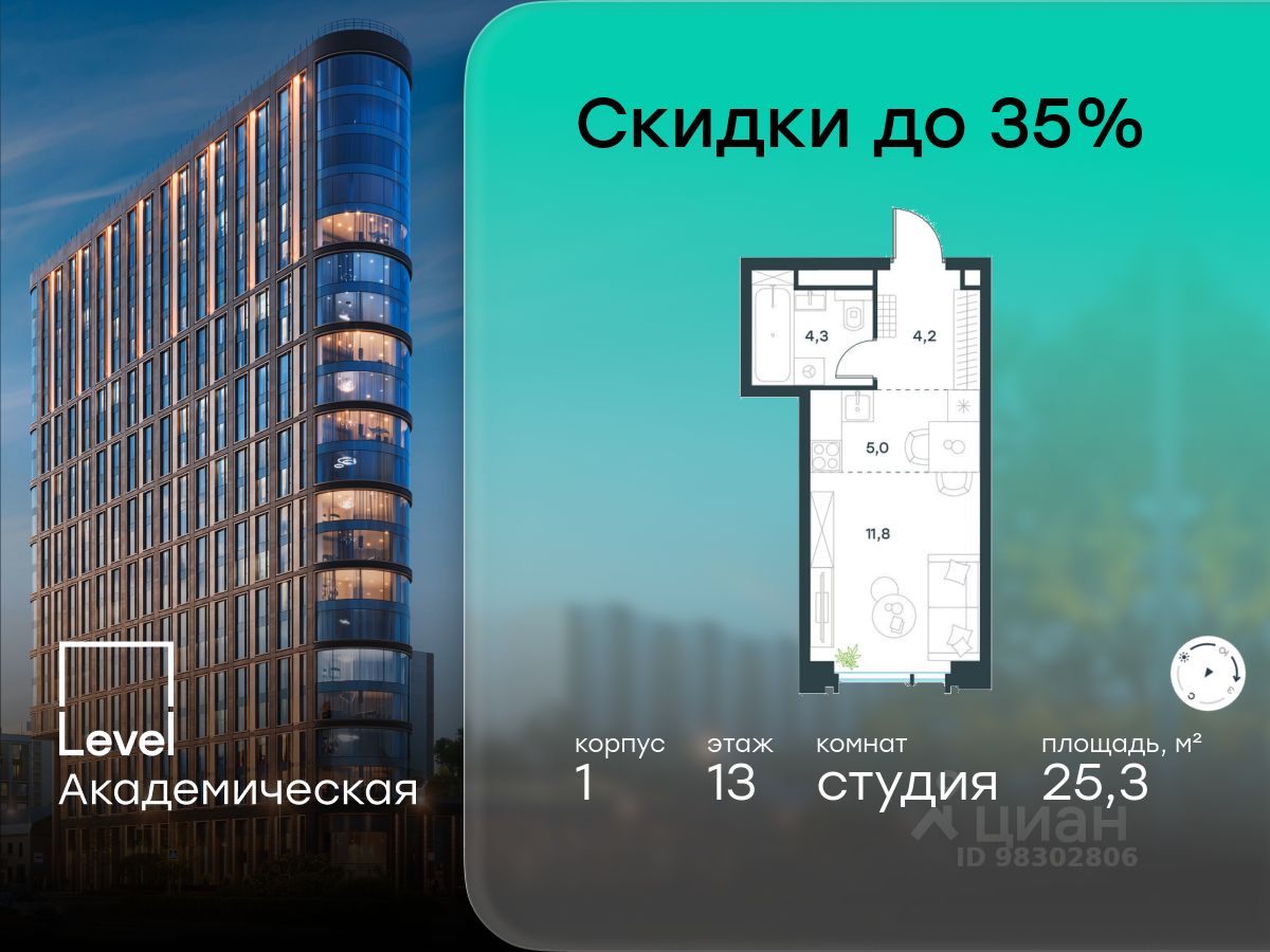 В Академическом районе продаётся квартира-студия площадью 25.30 кв.м без отделки. Квартира расположена на 13-м этаже 19-этажного жилого комплекса бизнес-класса Level Академическая (компания Level Group).