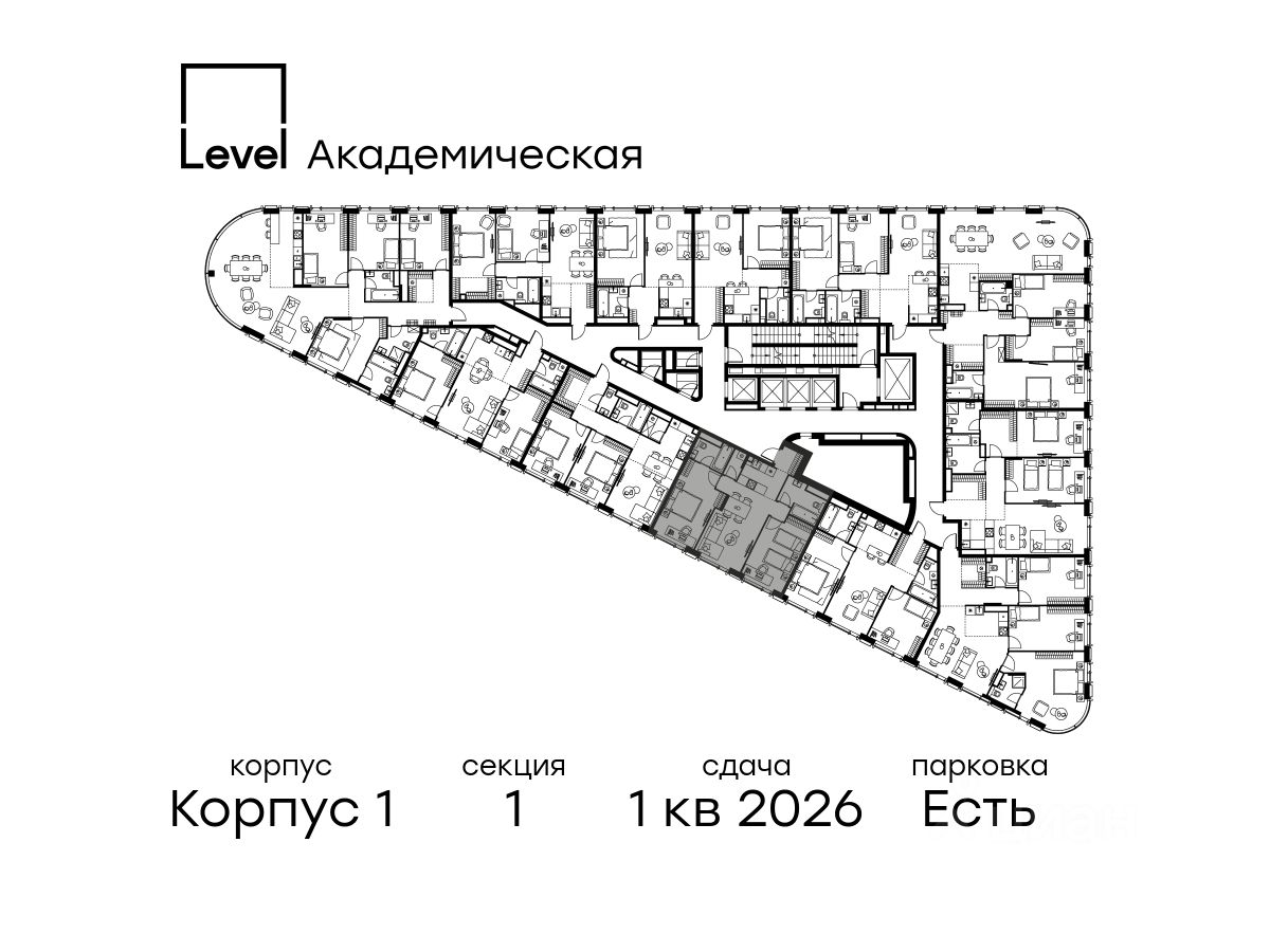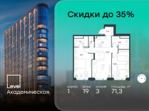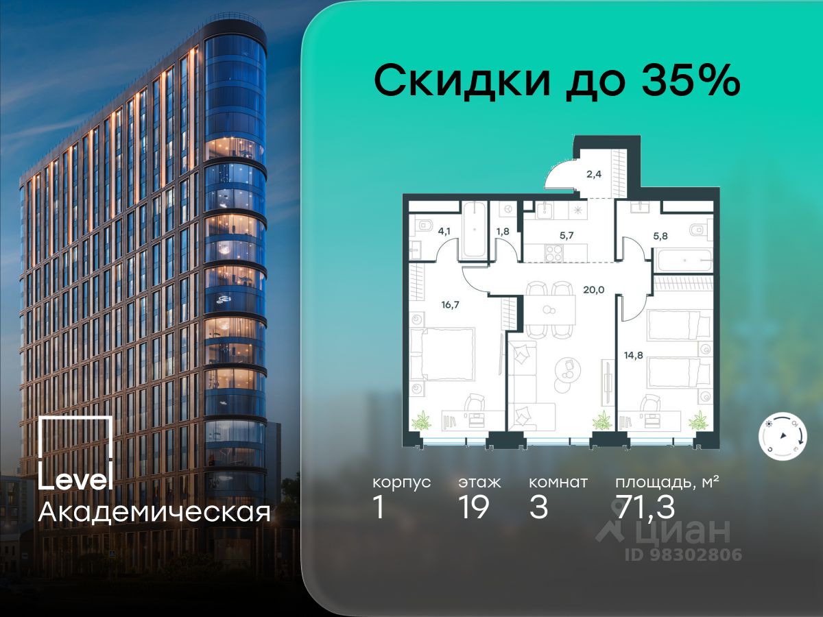 В Академическом районе продаётся 3-комнатная квартира площадью 71.30 кв.м без отделки. Квартира расположена на 19-м этаже 19-этажного жилого комплекса бизнес-класса Level Академическая (компания Level Group).