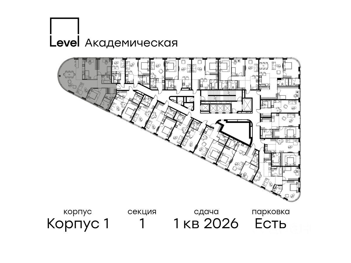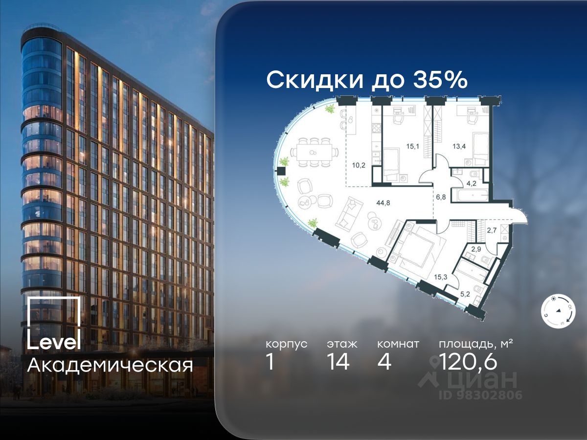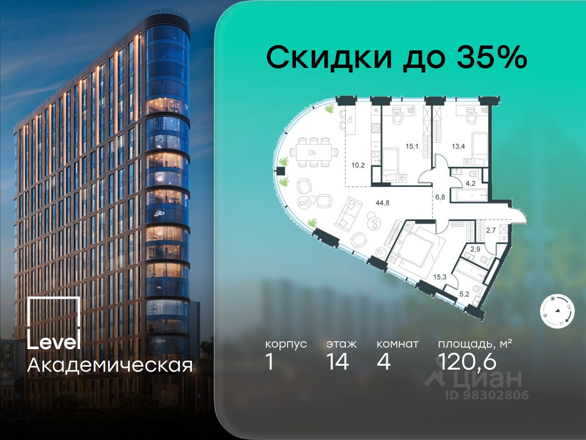 В Академическом районе продаётся 4-комнатная квартира площадью 120.60 кв.м без отделки. Квартира расположена на 14-м этаже 19-этажного жилого комплекса бизнес-класса Level Академическая (компания Level Group).
