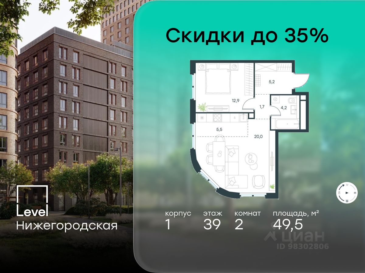 В активно развивающемся районе на юго-востоке столицы продается 2-комнатная квартира площадью 49,5 кв.м без отделки.. Квартира расположена на 39 этаже 45-этажного этажного корпуса 1 в жилом комплексе комфорт-класса Level Нижегородская (компания Level Group/Левел групп).