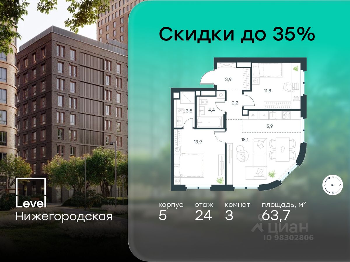 В активно развивающемся районе на юго-востоке столицы продается 3-комнатная квартира площадью 63,7 кв.м с отделкой "white box".. Квартира расположена на 24 этаже 29-этажного этажного корпуса 5 в жилом комплексе комфорт-класса Level Нижегородская (компания Level Group/Левел групп).