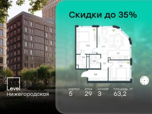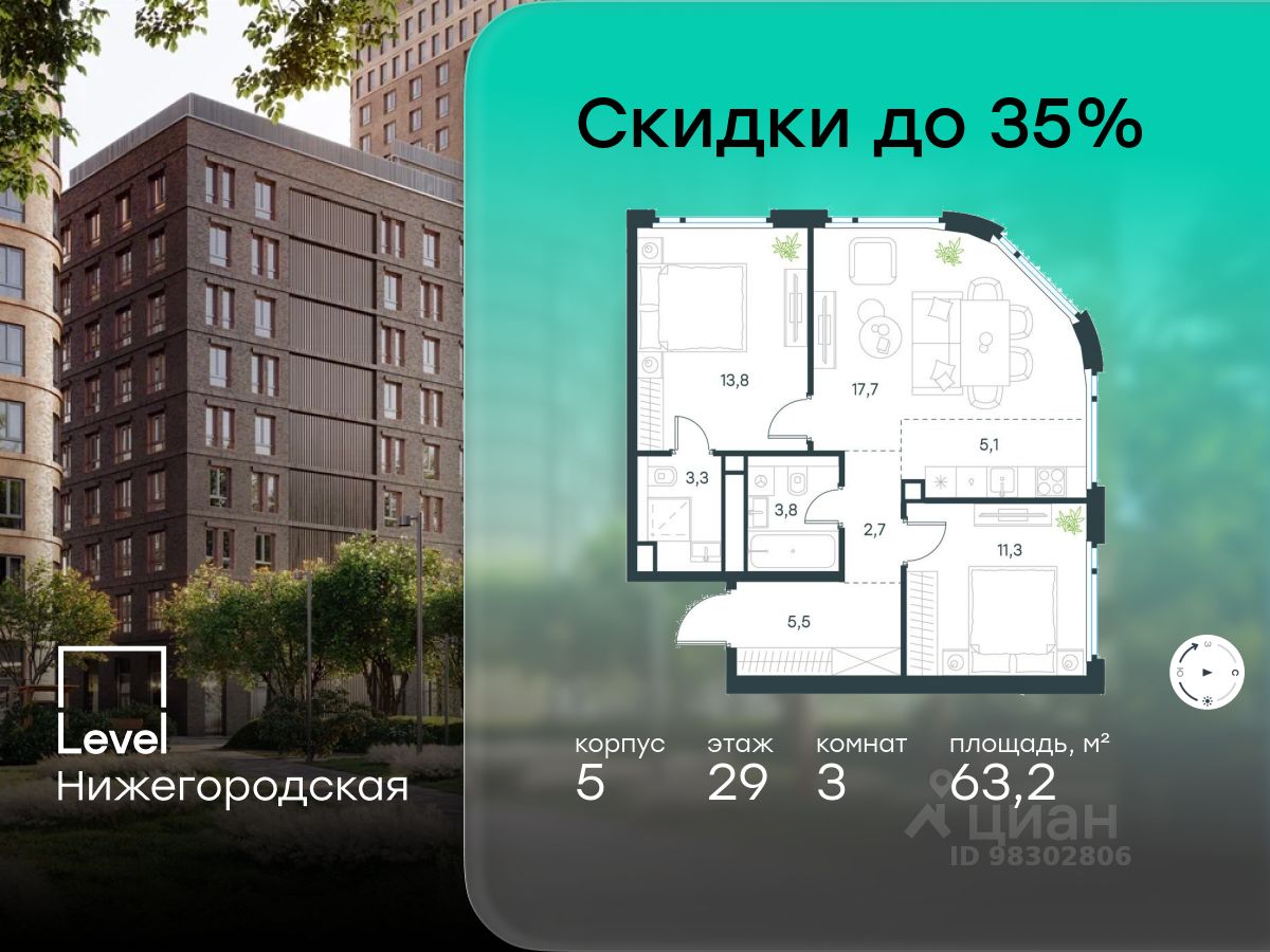 В активно развивающемся районе на юго-востоке столицы продается 3-комнатная квартира площадью 63,2 кв.м с отделкой "white box".. Квартира расположена на 29 этаже 29-этажного этажного корпуса 5 в жилом комплексе комфорт-класса Level Нижегородская (компания Level Group/Левел групп).
