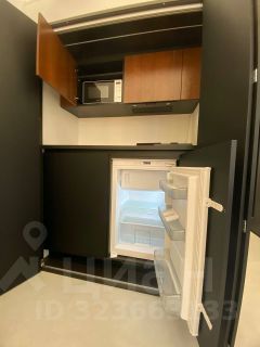 • Зона кухни закрывается раздвижными дверями, что позволяет трансформировать пространство первого этажа, избегая визуального шума. Кухня компактная и функциональная - встроенный холодильник, вытяжка, микроволновая печь, варочная панель.