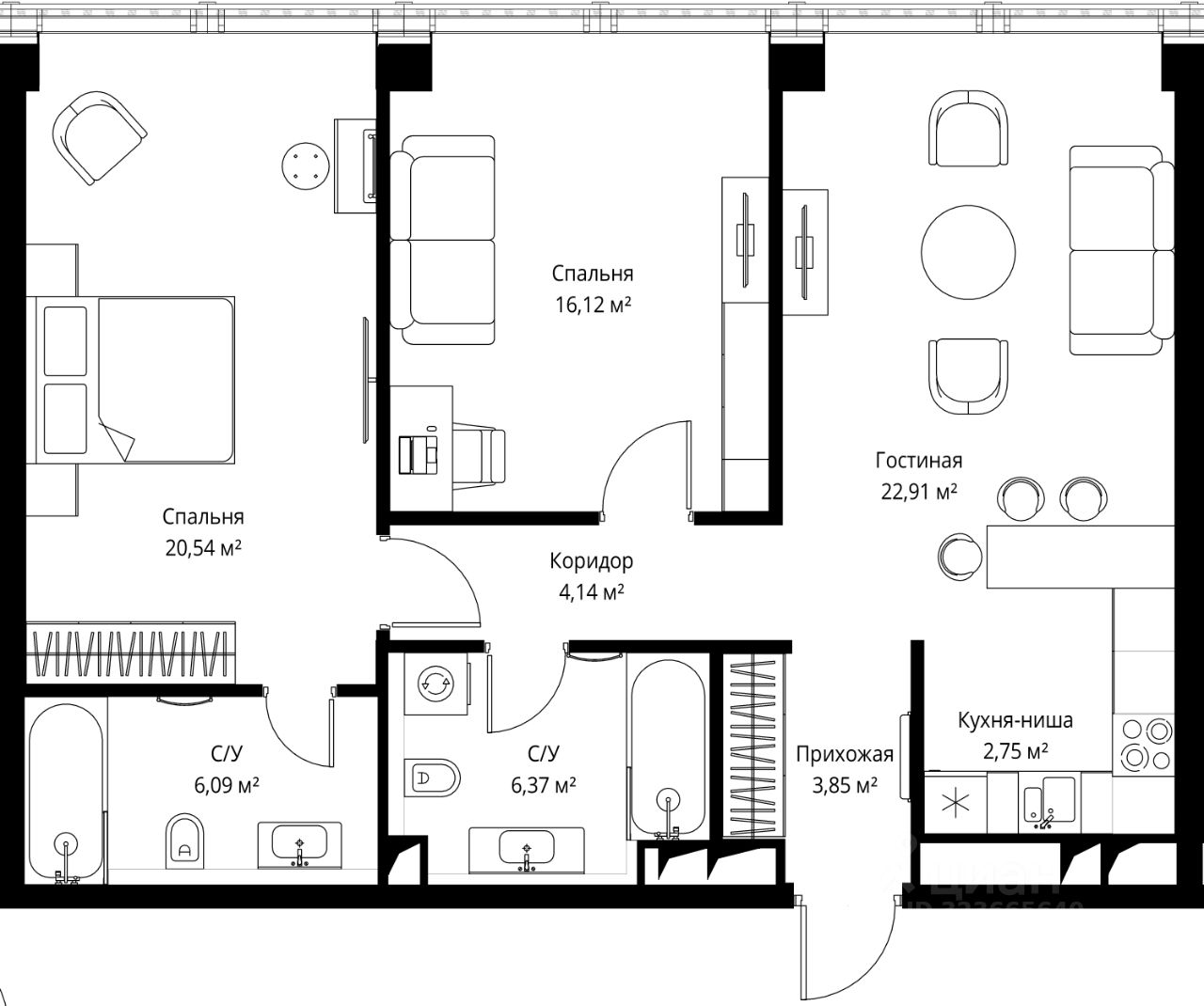 Продаётся 2-комнатная квартира площадью 82.77 м² без отделки на 57-м этаже премиального небоскреба Famous.