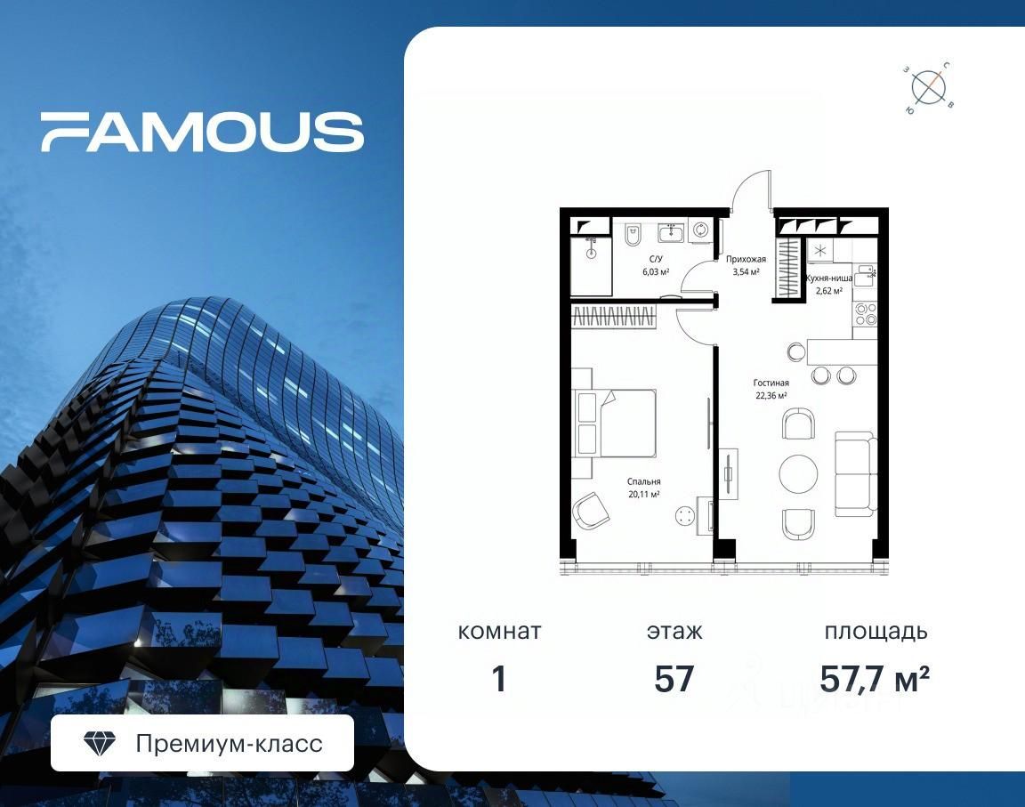 Продаётся 1-комнатная квартира общей площадью 57.70 м² без отделки на 57-м этаже премиального небоскреба Famous.