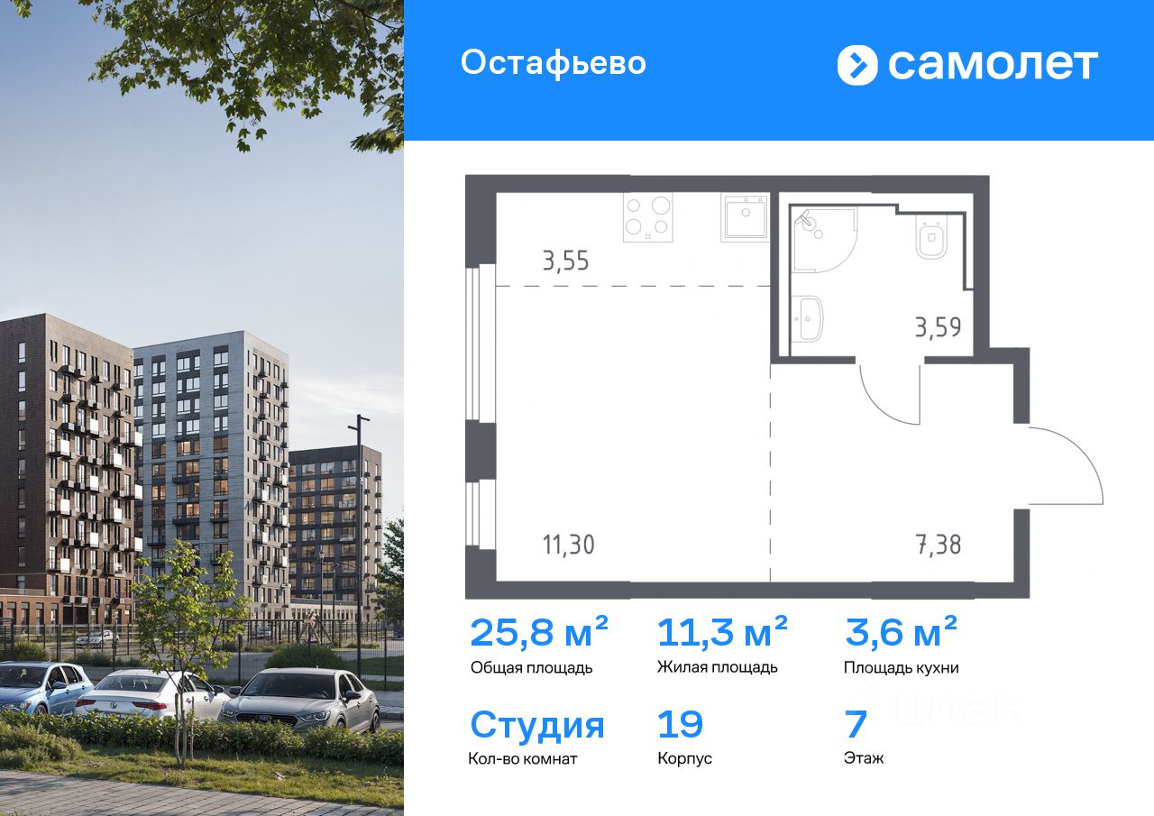 Строим кварталы для жизни с заботой о будущем. Предлагается квартира студия комфорт-класса 25,82 кв.м в корпусе 19 на 7 этаже, в ЖК "Остафьево"