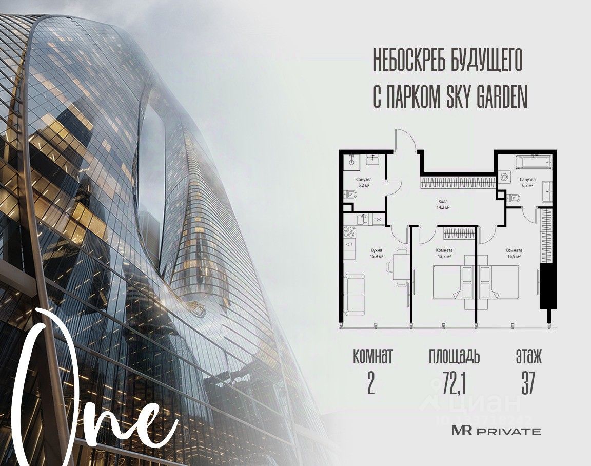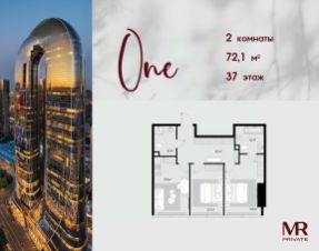 В продаже 2-комнатная квартира площадью 72.10 м² на 37-м этаже.