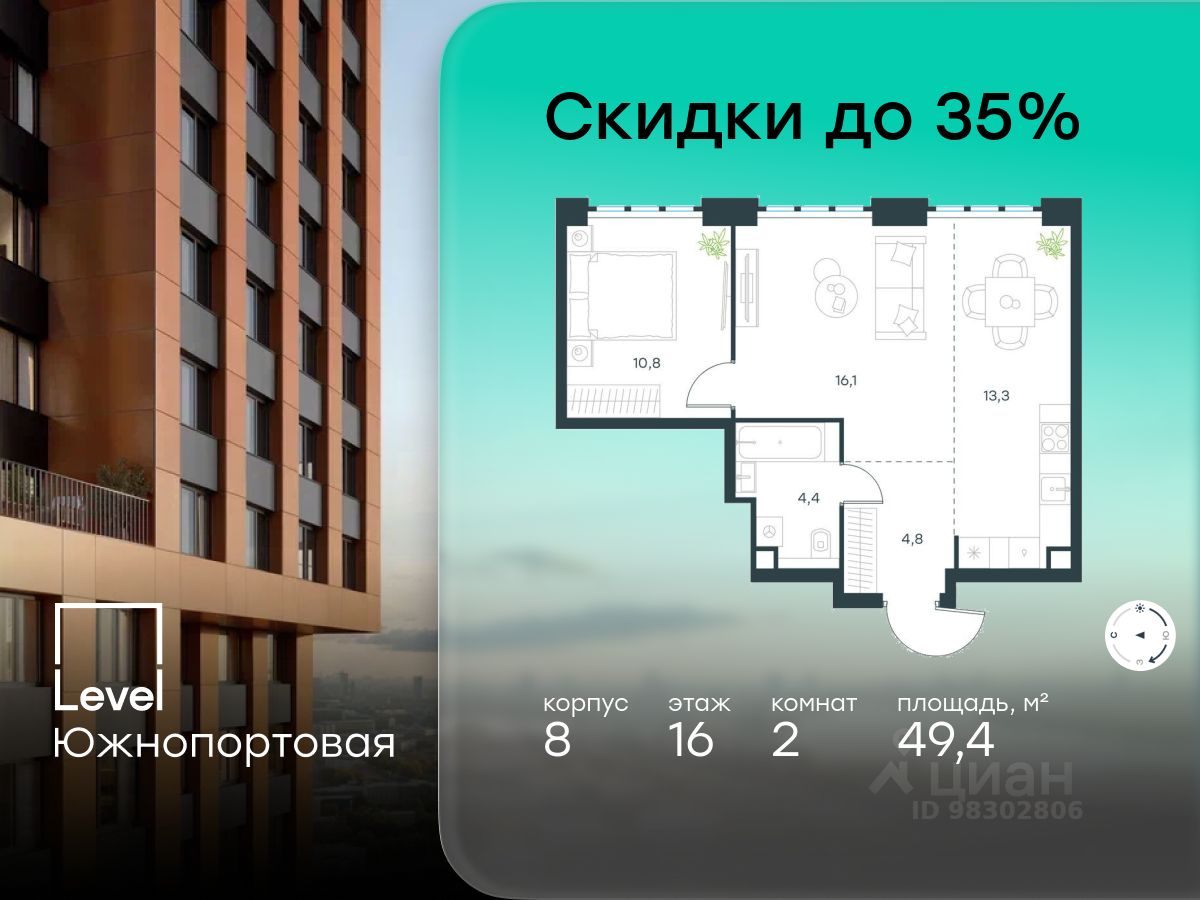 В северной части района Печатники продается 2-комнатная квартира площадью 49.40 кв.м без отделки. Квартира расположена на 16 этаже 49-этажного корпуса 8 в жилом комплексе комфорт-класса Level Южнопортовая (компания Level Group/Левел групп).