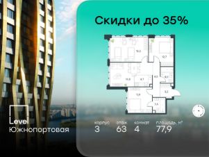 В северной части района Печатники продается 4-комнатная квартира площадью 77.90 кв.м без отделки. Квартира расположена на 63 этаже 68-этажного корпуса 3 в жилом комплексе комфорт-класса Level Южнопортовая (компания Level Group/Левел групп).