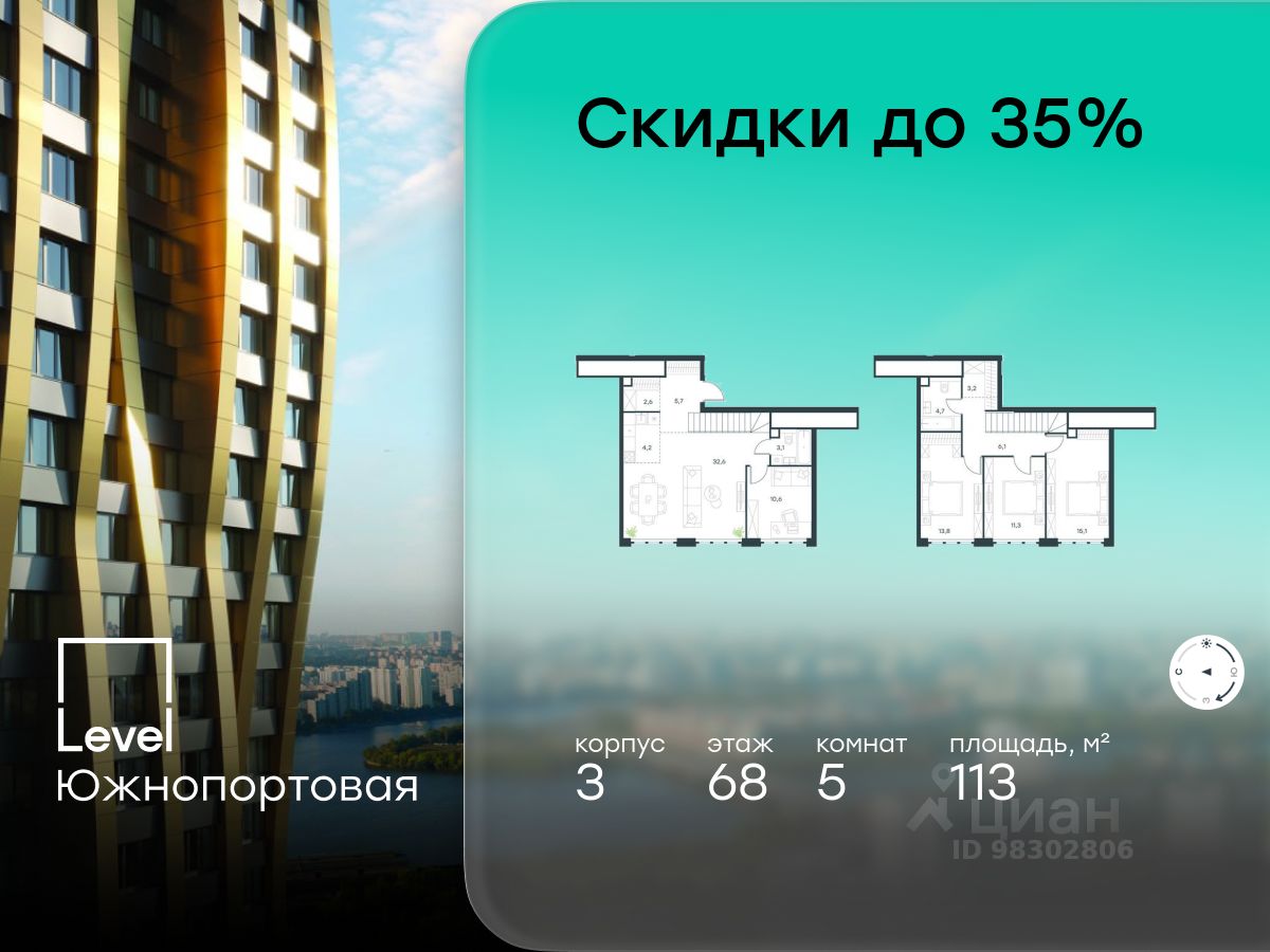 В северной части района Печатники продается многокомнатная квартира площадью 113.00 кв.м без отделки. Квартира расположена на 68 этаже 68-этажного корпуса 3 в жилом комплексе комфорт-класса Level Южнопортовая (компания Level Group/Левел групп).