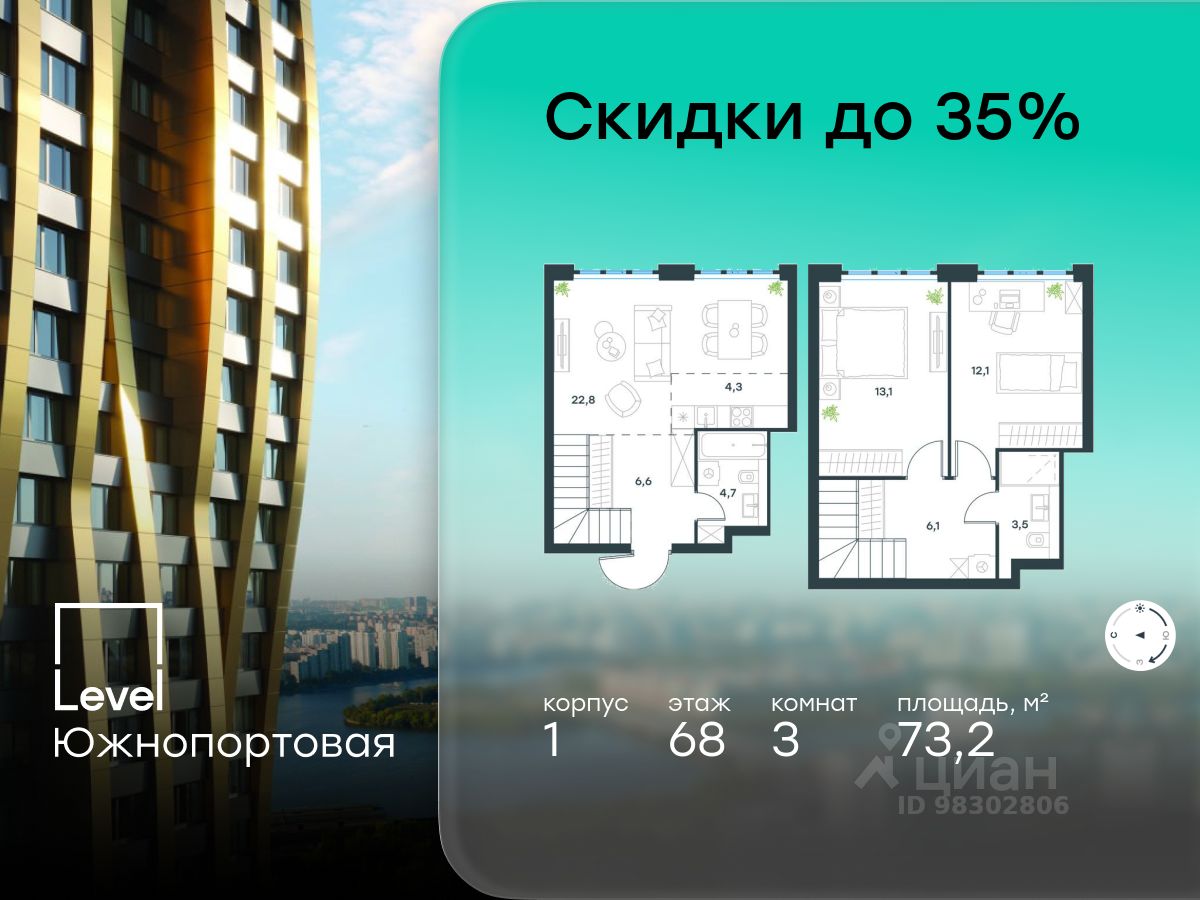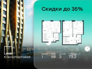 В северной части района Печатники продается 3-комнатная квартира площадью 73.20 кв.м без отделки. Квартира расположена на 68 этаже 69-этажного корпуса 1 в жилом комплексе комфорт-класса Level Южнопортовая (компания Level Group/Левел групп).