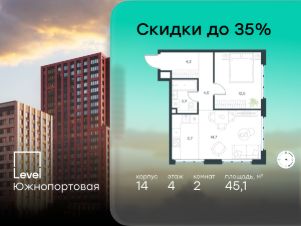 В северной части района Печатники продается 2-комнатный апартамент площадью 45.10 кв.м без отделки. Апартаменты расположены на 4 этаже 13-этажного корпуса 14 в жилом комплексе комфорт-класса Level Южнопортовая (компания Level Group/Левел групп).