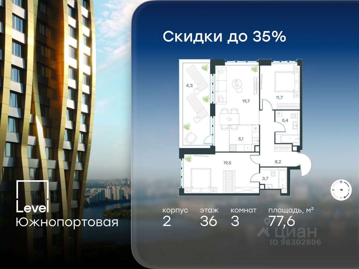 В северной части района Печатники продается 3-комнатная квартира площадью 77.60 кв.м без отделки. Квартира расположена на 36 этаже 47-этажного корпуса 2 в жилом комплексе комфорт-класса Level Южнопортовая (компания Level Group/Левел групп).