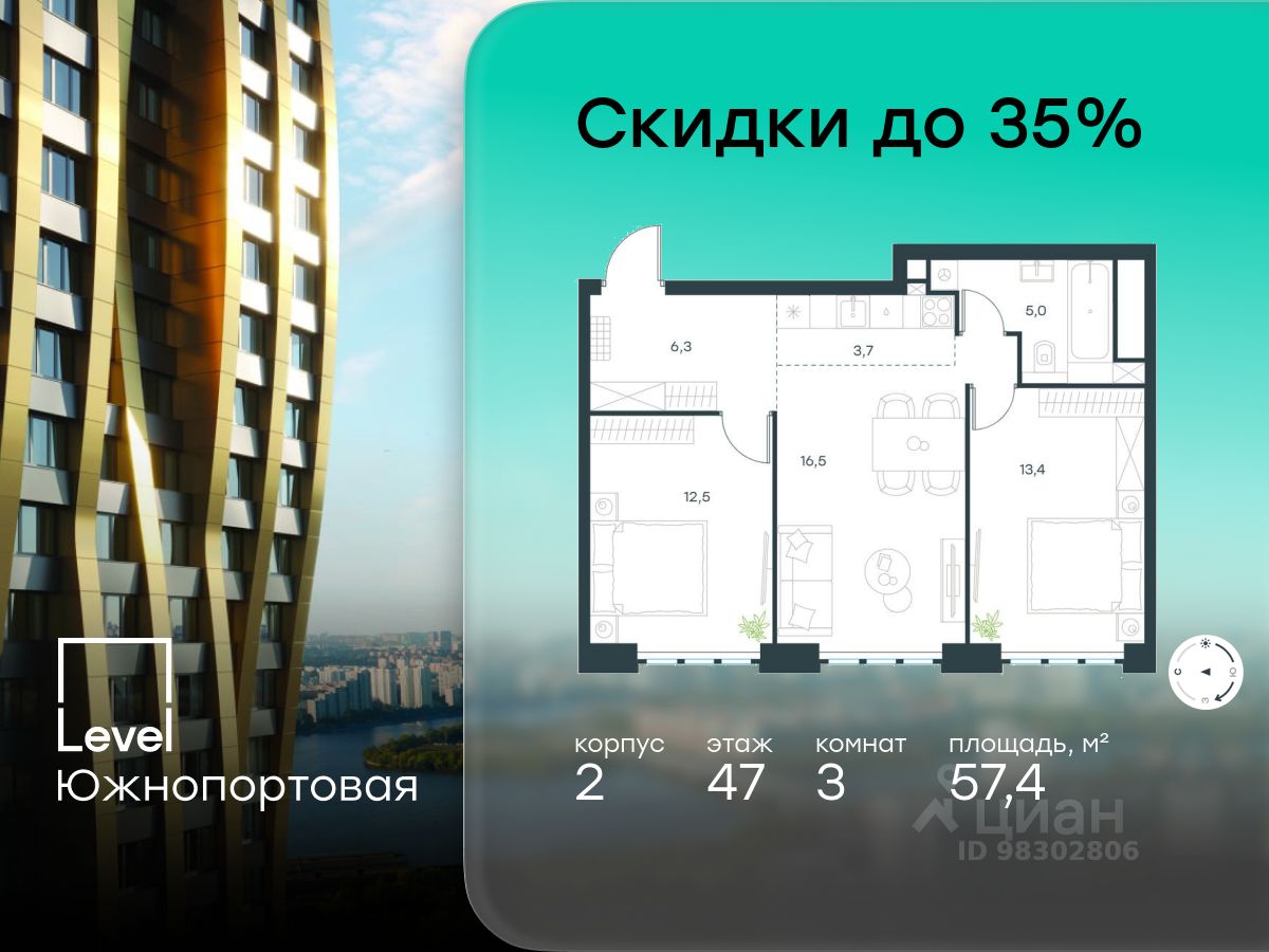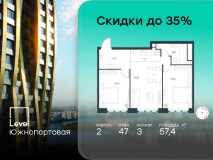 В северной части района Печатники продается 3-комнатная квартира площадью 57.40 кв.м без отделки. Квартира расположена на 47 этаже 47-этажного корпуса 2 в жилом комплексе комфорт-класса Level Южнопортовая (компания Level Group/Левел групп).