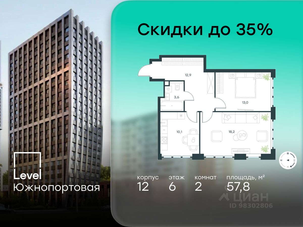 В северной части района Печатники продается 2-комнатная квартира площадью 57.80 кв.м без отделки. Квартира расположена на 6 этаже 20-этажного корпуса 12 в жилом комплексе комфорт-класса Level Южнопортовая (компания Level Group/Левел групп).