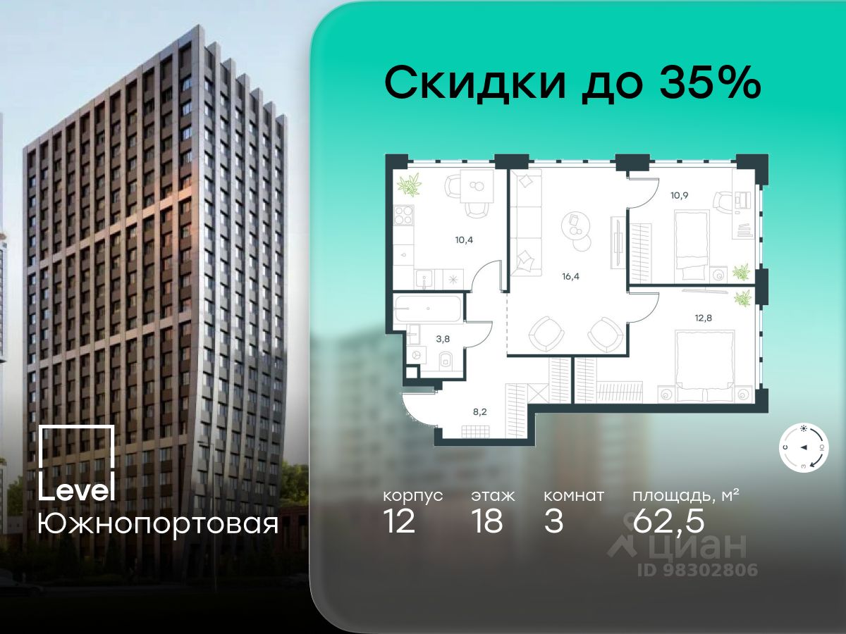 В северной части района Печатники продается 3-комнатная квартира площадью 62.50 кв.м без отделки. Квартира расположена на 18 этаже 20-этажного корпуса 12 в жилом комплексе комфорт-класса Level Южнопортовая (компания Level Group/Левел групп).