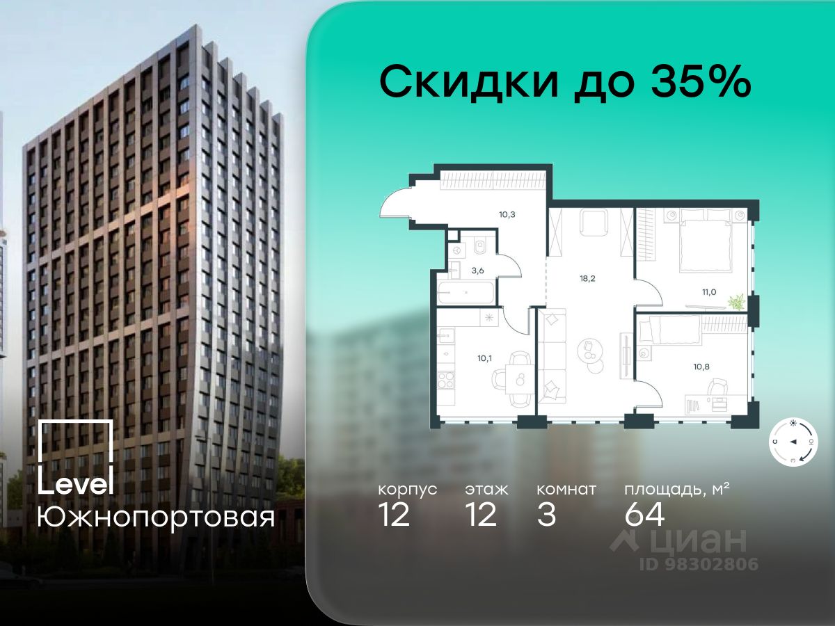 В северной части района Печатники продается 3-комнатная квартира площадью 64.00 кв.м без отделки. Квартира расположена на 12 этаже 20-этажного корпуса 12 в жилом комплексе комфорт-класса Level Южнопортовая (компания Level Group/Левел групп).