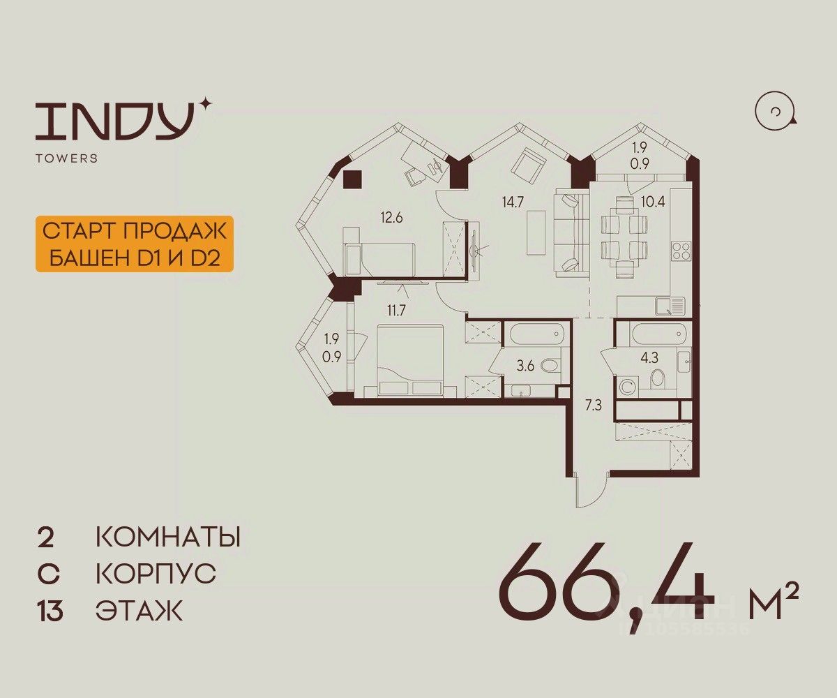 Продается просторная 2-комнатная квартира на 13 этаже жилого комплекса Indy Towers. Вид из окон: во двор. Срок сдачи: 4 кв. 2026 г.