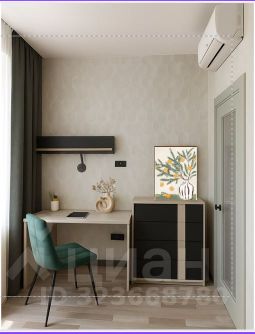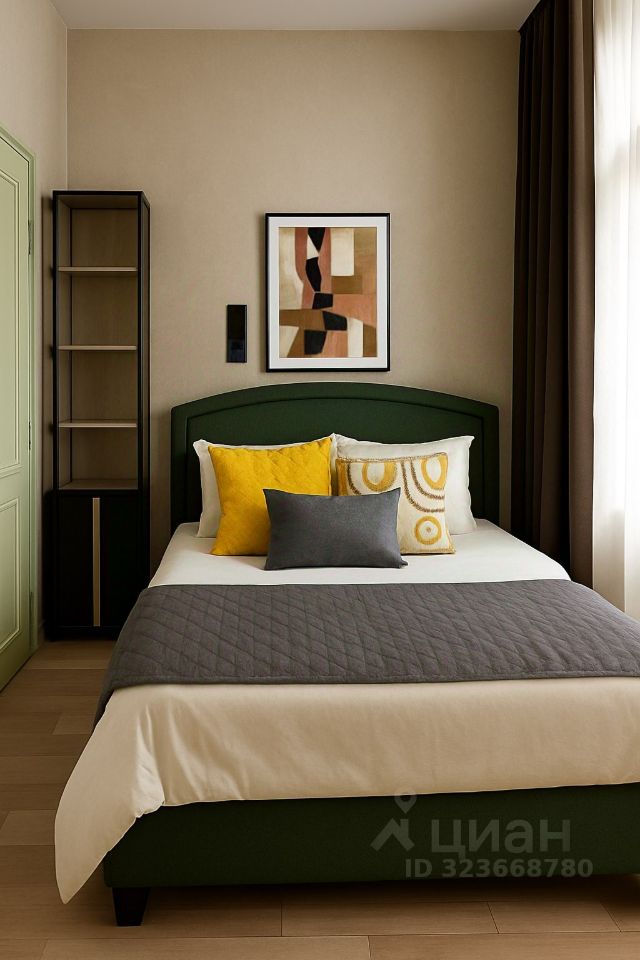 В спальне большая кровать с подъемным механизмом, удобный широкий стол, комод, стеллаж и вход в гардеробную. В гардеробной встроенный Г-образный шкаф и дополнительное место для хранения обуви.