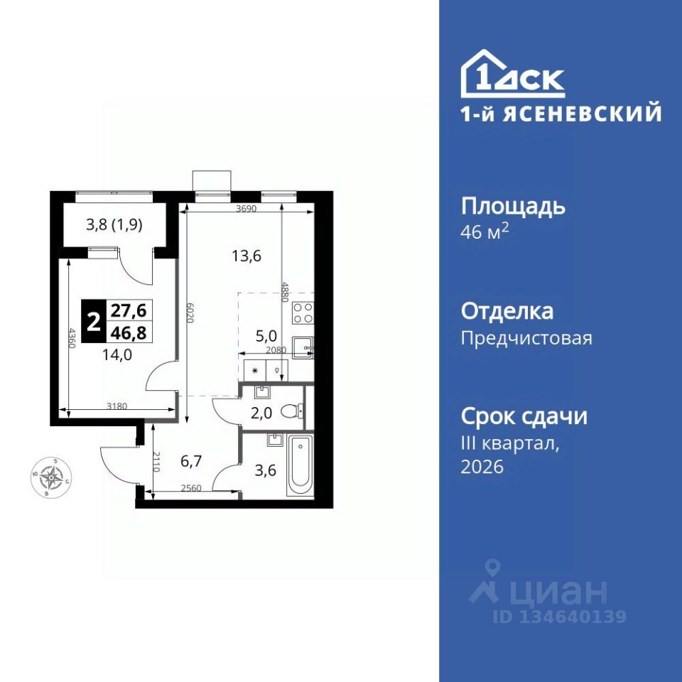 Продаётся 2-к квартира номер 259 общей площадью 46.8 кв.м. на 14-м этаже 16 этажного здания. Отделка Whitebox.