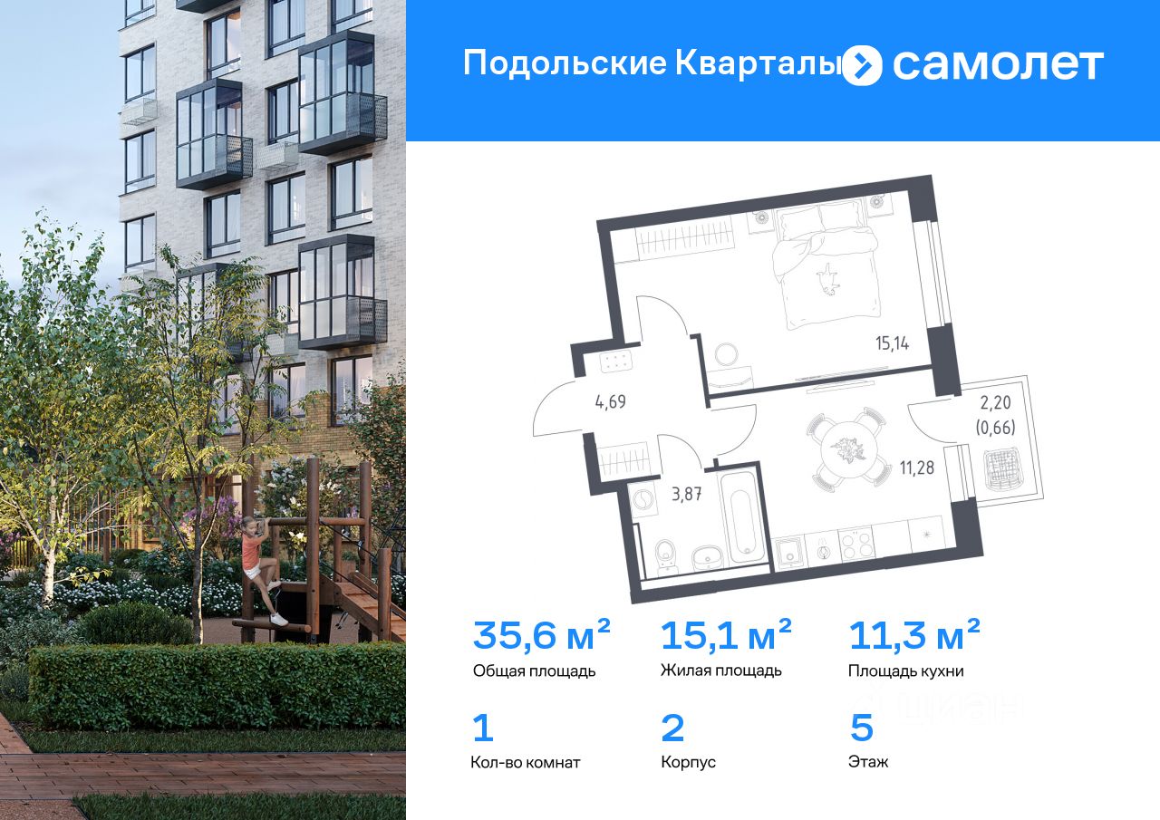 Строим кварталы для жизни с заботой о будущем. Предлагается 1-комнатная квартира комфорт-класса 35,64 кв.м в корпусе 2 на 5 этаже, в ЖК "Подольские Кварталы"