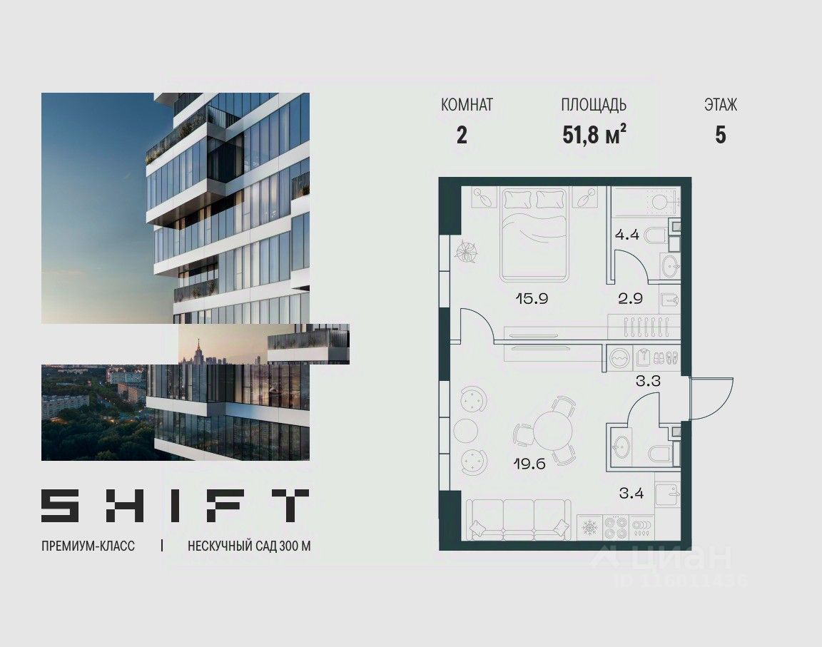 1-к квартира в премиальном комплексе SHIFT на 5-м этаже в 18 этажном здании. Общая площадь 51.8 кв. м.