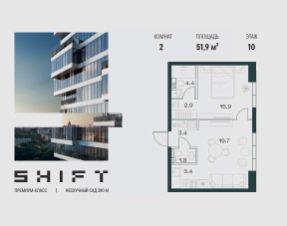 1-к квартира в премиальном комплексе SHIFT на 10-м этаже в 18 этажном здании. Общая площадь 51.9 кв. м.