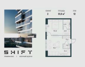 1-к квартира в премиальном комплексе SHIFT на 12-м этаже в 18 этажном здании. Общая площадь 51.8 кв. м.