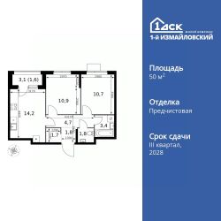 Продаётся 2-к квартира номер 990 общей площадью 50.8 кв.м. на 12-м этаже 25 этажного здания. Отделка Whitebox. Цена с учётом скидки.