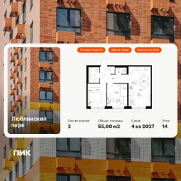 Продаётся 2-комн. квартира площадью 55,6 кв.м на 14 этаже 25 этажного дома (Корпус 18-20, Секция 1) проекта ПИК Люблинский парк. Светлый просторный подъезд на уровне земли, функциональная планировка, большие окна, c отделкой.