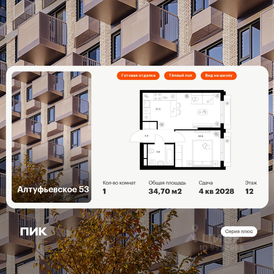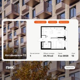 Продаётся 1-комн. квартира площадью 34,7 кв.м на 12 этаже 32 этажного дома (Корпус 1.1, Секция 4) проекта ПИК Алтуфьевское 53. Светлый просторный подъезд на уровне земли, функциональная планировка, большие окна, c отделкой.