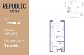 Продается 1комнатная квартира на 4 этаже от застройщика Страна Девелопмент. Площадь квартиры 26,86 кв. м.