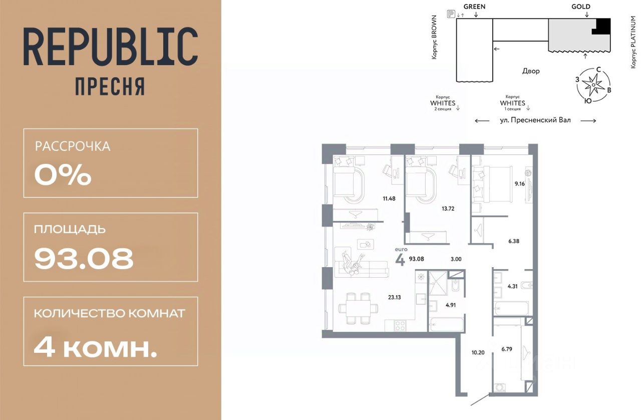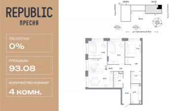 Продается 4комнатная квартира на 17 этаже от застройщика Страна Девелопмент. Площадь квартиры 93,08 кв. м.