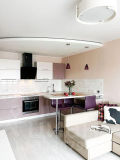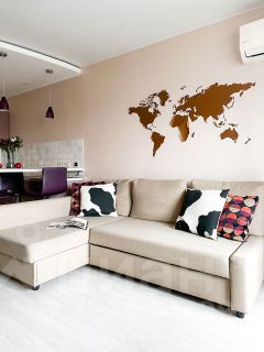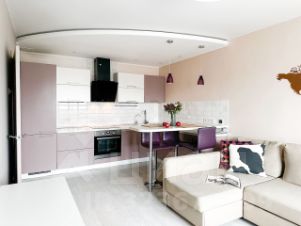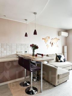 Кухня-гостиная: полноценный кухонный гарнитур, встроенный холодильник, духовой шкаф, посудомойка, раскладной диван, стол. В квартире два кондиционера.