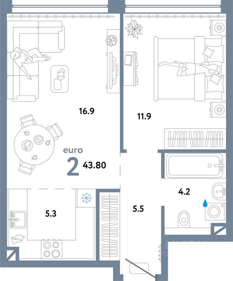Продаётся 2-комнатная квартира в строящемся доме (Дом 1), срок сдачи: II-кв. 2026, общей площадью 43.8 кв.м., на 9 этаже. Многоэтажные жилые дома с объектами инфраструктуры, расположенные по адресу: г. Москва, внутригородское муниципальное образование Очаково - Матвеевское, ул. Озерная, вл. 42.