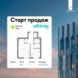 Старт продаж! Продаётся 1-комнатная квартира от застройщика ГК "КОРТРОС" в жилом комплексе бизнес-класса ULTIMAcity. Квартира расположена на 24 этаже 45 этажного корпуса 1. Общая площадь 55,21 м². Без отделки.