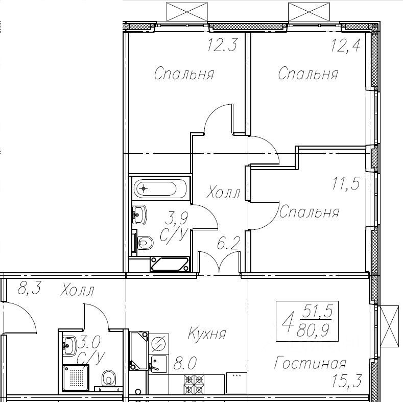 — 3 спальни по 12м2 (1 родительская и 2 детские, одна из которых с двумя угловыми окнами);