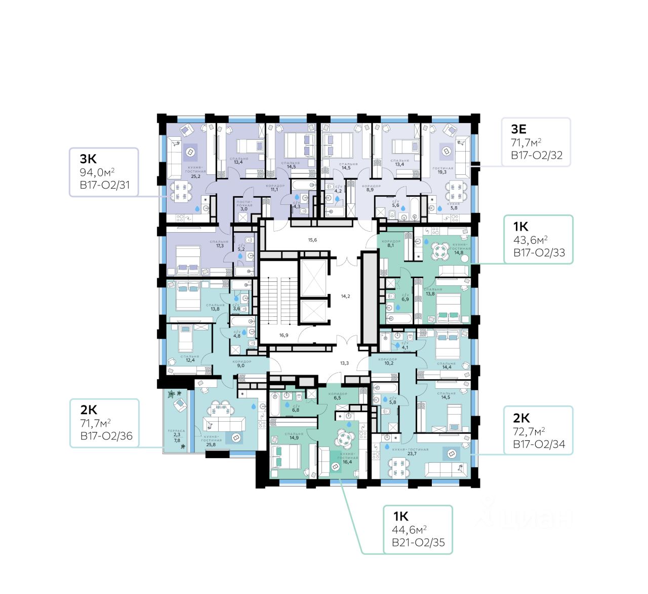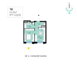 В продаже — однокомнатная квартира с чистовой отделкой, общей площадью 44,6 кв. м. Квартира расположена на шестом этаже девятиэтажного дома класса Оптимум в квартале В17 нового района СберСити, который строит Сбер. Всего в доме — 48 квартир.