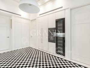 Все элементы декора, люстры и светильники подобраны по индивидуальному дизайн-проекту, дополнительным украшением интерьера служат колонны и расписные стены. Функциональная планировка: гостиная с выходом на балкон, кухня-столовая, мастер-спальня с собственной гардеробной и ванной, 2 спальни, 3 санузла, гардеробная, постирочная, холл. Благодаря большому количеству окон пространство наполнено светом, открываются панорамные виды на улицу Пречистенка, Лопухинский переулок и во внутренний двор.