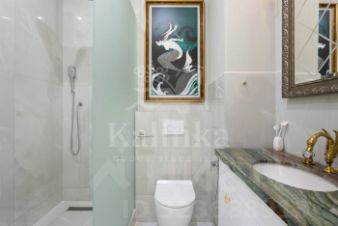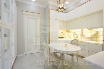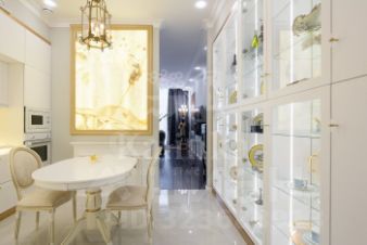 Отделка выполнена в стиле Old Money с просторной кухней, тремя гардеробными и двумя санузлами, что соответствует всем современным тенденциям. В отделке кухни и санузлов использованы только натуральные материалы: мрамор, оникс и кварцит. Во входной группе на полу — мраморная мозаика из редких пород камня.
